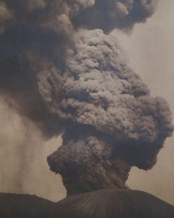 Un’impressionante fotografia di Frank. A. Perret, in prestito dalle collezioni di geologia, cattura l’enorme colonna di cenere prodotta dall’eruzione che, nella notte tra il 7 e l’8 aprile, causò il collasso del cratere sommitale.