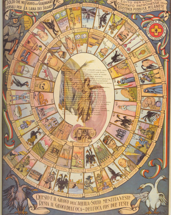 Il gioco (un tabellone di carta di 48,4 cm x 62 cm) porta in calce la scritta Questo è il gioco dell’Aquila sotto mentita veste. Resta il giuoco dell’Oca, dell’Oca con due teste. Le parole e le immagini fanno intuire subito un patriottismo che induce i giocatori a considerare i nemici con disprezzo e ostilità. L’Austria-Ungheria, rappresentata dall’Aquila a due teste, deve essere schiacciata dai soldati italiani! Sono proprio i soldati che devono essere sostenuti e aiutati: nel gioco infatti compare la scritta I soldi che nel giuoco hai guadagnati, versali per la lana dei soldati. Questo gioco da tavolo fa comprendere come spesso i giochi non sono “neutri”, anzi veicolano idee e ideologie che il mondo adulto impone all’infanzia!